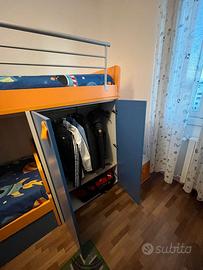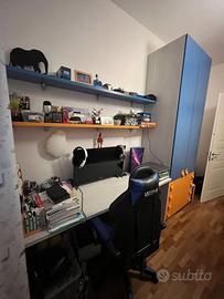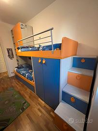 cameretta completa con lato 1 di 376 cm di lunghezza composto da libreria (35 cm) + due letti a castello + terzo letto sotto il principale + armadio con guardaroba in alto) + armadio basso sotto letto superiore con uno scomparto + guardaroba (il tutto di 296 cm)+ cassettiera a scala (45 cm). Lato 2 (270 cm) composto armadio (Largh. 90x Prof. 58x H260) completo di 4 cassetti + 2 scomparti + scrivania (180 cm x 58cm) + 2 mensole da 180 cm. La camera è poco usurata salvo scrivania piccola ammaccatura di cui posso inviare foto.