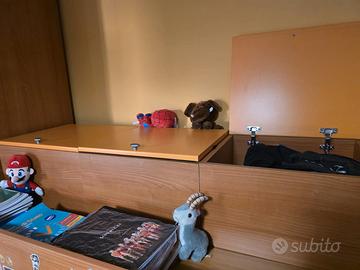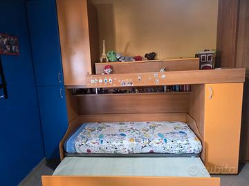 camerette in buone condizioni, un letto+ un letto estraibile+un letto a castello (io al posto del letto ho messo n.3 cassettoni molto ampi come da foto). In più angoliera e libreria e comodino+atro cassettone.Colore arancio e blu.