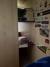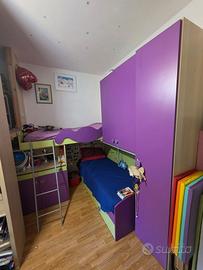 Vendesi cameretta con letti a castello lineare con armadio , viola e lime, modificata ad angolare ma ripristinabile senza alcuna modifica . Composta da letto superiore , letto inferiore e letto a scomparsa con doghe e con piedi retrattili. Dotata di scala,scrivania a scomparsa, due mensole , due colonne di cui una con cassetti .