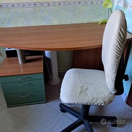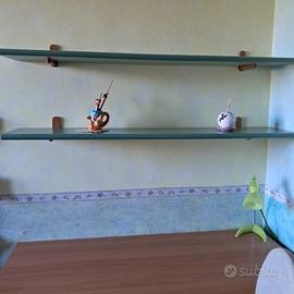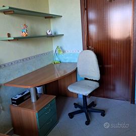 Cameretta con due letti , scrivania sedia mensole.