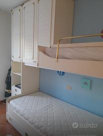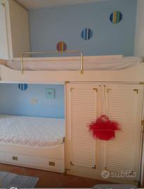 Camera con armadi profondi su unica parete, 2 letti, 1 piazza e mezza sotto, 1 piazza sopra, scaletta e cassettoni sotto letto, ottime condizioni