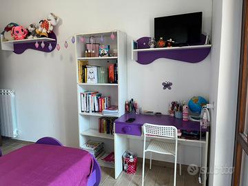 Vendo cameretta a ponte con due letti singoli per femminucce. La cameretta è tenuta in buono stato. Cassetti e ante come nuovi. L'unica cosa ci sono degli stickers alle ante ma si possono rimuovere. Insieme al ponte si vende scrivania con sedia, due mensole e libreria. La cameretta è stata comprata nel 2015. Esclusi smontaggio e trasporto.