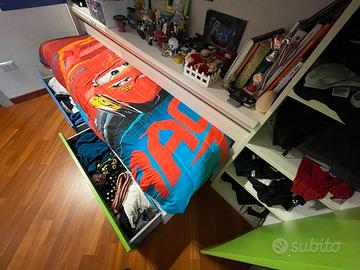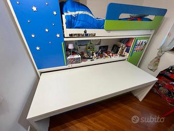 n.2 letti a castello entrambi scorrevoli, con scalette laterali e sponda amovibile per letto superiore, vano centrale, n.2 colonne armadio laterali e n.2 cassettoni bassi, di cui uno da sistemare (uscito dalla guida). Scrivania estraibile scorrevole.