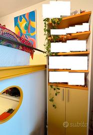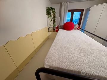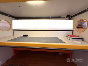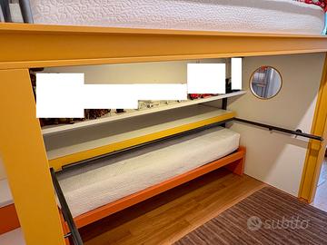 Vendo soluzione a 2 letti con libreria separata di Erba, mobili di qualità ed attenzione al dettaglio. La composizione, modello Navigator, comprende due letti con scrittoio legno in colore bianco estraibile e scorrevole sotto il soppalco. Il letto superiore comprende la protezione in ferro e la rete ortopedica. Il letto inferiore estraibile, posizionato sotto alla scrivania, ha rete ortopedica ed è in legno laccato colore arancio. La scala angolare di sinistra è in laminato antigraffio bianco puntinato di grigio e i 3 cassetti sono apribili e sfruttabili internamente. La composizione della cameretta comprende un pannello nel retro del soppalco laccato ondulato in colore giallo chiaro. La composizione del letto a soppalco è larga 224cm, alta 198 cm e, con la scala laterale, è larga in totale L.275 cm.