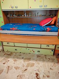 Cameretta colore ciliegio e verde, con 2 mensole a vista e 6 interne, 1 letto a ponte e 1 letto a cassetto, scrivania a scomparsa, 6 ante armadio, 7 cassetti e 2 sportelli inferiori.