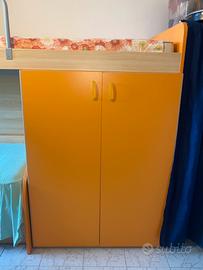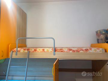 Comoda e compatta cameretta con tre postazioni letto e tre ante armadio. In piu possiede uno scompartimento aperto laterale sotto al quale sono presenti tre cassetti. Purtroppo, essendo il limite di foto soltanto 6, non ho potuto aggiungere dettagli né dei piccoli difetti, se siete interessati posso procurare tramite chat. Il letto inferiore (ultima foto) si può alzare a livello di quello centrale. Il letto centrale è estraibile. Includo in regalo tre materassi, la luce da letto (a forma di coccinella, la quale è presente in foto), la scaletta ed il paracolpi per il letto superiore. Non è compresa invece l’oggettistica nei ripiani in foto.