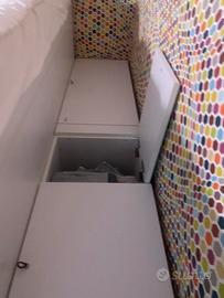 3 letti singoli con corridoio e scale con contenitori, negli scalini e nel passarella ci sono ampi vani spaziosi, armadio 2 ante + 2 cassettoni alti + libreria + scarpiera + 2 materassi (scrivania in omaggio). Piccolo difetto al coprimi materasso inferiore €200 … ritiro celere🙏