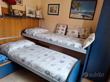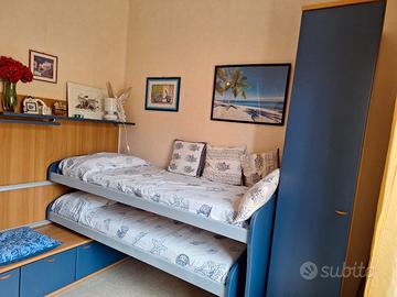 cameretta di ottima qualità a 2 letti estraibili su ruote, in legno e laminato blu, completa di pannello in legno con mensole, sedute con 3 cassettoni ed armadio ad una anta. Possibilità di posizionare l'anta in varie soluzioni. Veramente bella.