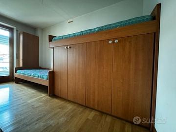 Vendo cameretta in legno moderna in ottime condizioni molto funzionale e capiente con un letto rialzato dotato di scaletta e sbarra in ferro per la sicurezza dei più piccoli, comprende un vano a ripiani e un doppio armadio a quattro ante perfetta per una stanza lunga e stretta o per una parete lunga almeno 4 metri. Il ritiro è esclusivamente in loco a carico dell'acquirente. Possibilità di avere anche i materassi, prezzo trattabile