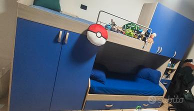 Cameretta a castello con mezza cabina armadio 3 ante doppio cassettone basso letto 3 cassetti e 2 scompartimenti e scaletta , vendo per cambio arredamento ... Altezza 2.35 m larghezza 3.50 m
