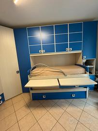 Vendo cameretta a ponte 3 letti estraibili con ruote completa di cabina armadio e ulteriore armadio 2 ante e 2 cassetti. 2 scrivanie con cassetti al di sotto. Gli armadi sono completi di mensole interne.