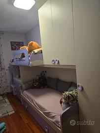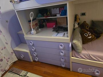 Cameretta a ponte con terzo letto estraibile, scrivania, cassettiera, mobile a colonna e a doppia anta.