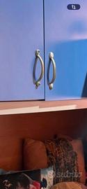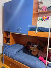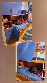 Vendo cameretta completa a ponte, ideale per bambini/ragazzi, in ottime condizioni. Struttura solida in legno con finitura blu e color ciliegio. Composta da: •Letto inferiore + letto superiore con scaletta laterale •Ampio armadio a ponte con ante capienti •Cassettiera integrata (4 cassetti) •Mensole e vani portaoggetti •Cassetto sotto letto utilizzabile sia come contenitore che come spazio per inserire una seconda rete/letto estraibile La cameretta è molto funzionale e salvaspazio, perfetta anche per chi ha bisogno di un posto letto in più. Presenta un piccolo danno in una zona (visibile in foto), puramente estetico e non compromette l’utilizzo della cameretta.