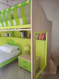 Cameretta a ponte angolare della Moretti Compact sui toni del verde e legno chiaro completa di reti e materassi più kit di ritocco colore. L'armadio è abbellito da intarsio lineare. Tenuta molto bene. Il letto sotto ha le ruote per facilitare lo spostamento come pure il comodino. E' abbellita da mensole riponi oggetti sia sotto che sopra. Misure: Altezza armadio 225cm. Ingombro totale: 375cm x 230cm. Scala ampia per salire da 45cm composta da cassetti porta oggetti come pure la passerella. Smontaggio e trasporto a carico dell'acquirente. Prezzo leggermente trattabile