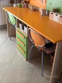 Cameretta per bambini o ragazzia unisex completa di armadio a ponte con due letri e due materassi piu scrivania doppia due sedi colore arancio /verde da smontare e portare via.