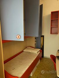 Vendo camera da letto completa, ideale per bambini o ragazzi, in buone condizioni generali. Arredo funzionale, solido e ben organizzato, perfetto per ottimizzare gli spazi. La camera comprende: -Letto singolo con struttura contenitore e materasso incluso -Ponte con armadi pensili e vani contenitivi -Scrivania abbinata con sedia -Cabina armadio angolare, molto capiente e pratica -Mensole e moduli a parete coordinati Struttura realizzata con materiali resistenti, pensata per un utilizzo quotidiano. Colori vivaci ma equilibrati, adatti sia a bambini che a ragazzi. Ottima soluzione completa “chiavi in mano”, senza bisogno di ulteriori acquisti. Smontaggio e ritiro a carico dell’acquirente.