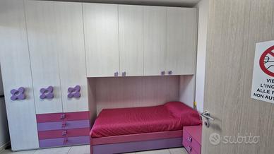 Vendo camerina Battistella nidi. Ottimo materiale, colore olmo, fuxia e lilla con maniglie a fiore. Lunghezza totale 3.50, letto singolo 90x200, componibile, con letto estraibile a scomparsa 2 materassi di cui quello sopra in memory.
