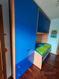 Dimensione L. 300 cm x H 255 cm. composta da: armadio laterale 2 ante con in basso 2 cassetti alti e profondi + 2 letti mobili con 4 cassetti bassi + 2 grandi ante con appendi abiti scorrevoli sopra il letto + libreria 3 scaffali + pomelli di ricambio e colore originale per eventuali ritocchi.