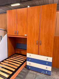 Cameretta a ponte ciliegio/blu con armadio 4 ante completa di rete a doghe