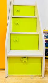 La scala con sportelli e cassettone finale con ruote e’ molto capiente e si può spostare (indipendente dalla struttura a ponte).