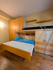Vendo bellissima cameretta a ponte completa, ideale per ottimizzare lo spazio in stanze condivise. La struttura è robusta, in ottime condizioni estetiche e offre una capacità di contenimento elevatissima grazie alla combinazione di armadi e cassetti.
