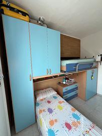 Vendo, per cambio arredamento, cameretta completa in buone condizioni, ideale per bambini e ragazzi. I mobili sono robusti e funzionali e vengono venduti inclusi i due materassi visibili in foto.