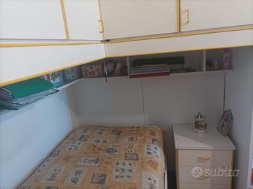 Cameretta angolare colore bianco con profili gialli incluso: 2 reti a doghe, 2 materassi, una libreria, 1 scrivania e 2 cassettiere.