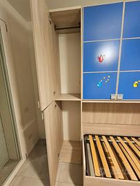 misure: 290x53cm ( profondità) + scrivania da 91x56 + 3 moduli da 45cm ciascuno ( cassetti + armadio ) e a parte le mensole