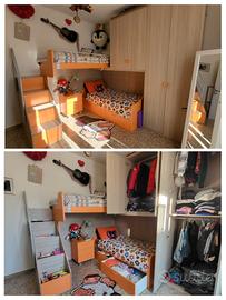 Cameretta a ponte completa – ottime condizioni, già smontata (550€ trattabili) Vendo cameretta completa a ponte per bambini/ragazzi, molto robusta e tenuta benissimo. Soluzione salvaspazio ideale per stanze piccole o per chi cerca ordine e comodità. 📐 Misure totali Larghezza: 3,02 m Profondità: 2,50 m Altezza: 2,62 m 🛏️ Composizione Letto superiore con barriera di sicurezza Scala laterale solida Letto inferiore con 2 ampi cassettoni porta-oggetti Armadio a ponte molto capiente Comodino su ruote con 3 cassetti Materassi inclusi Struttura in legno chiaro con dettagli arancioni, molto luminosa e moderna. ℹ️ Informazioni Visionabile senza impegno cameretta già smontata Trasporto a carico dell’acquirente Disponibile subito 💶 Prezzo 600 € trattabili Contattami pure per altre foto o per vederla dal vivo.