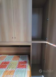 Vendo cameretta a ponte con mensola, ampio armadio con 7 ante e cassettiera composta da 5 cassetti. 2 letti singoli in dotazione, di cui uno a scomparsa.