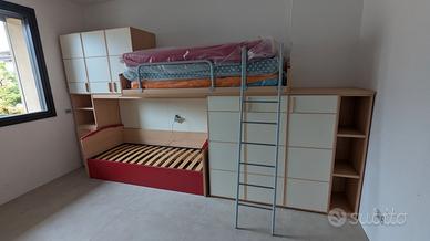 Vendo cameretta a ponte completa, ideale per bambini o ragazzi, composta da: - letto singolo inferiore - letto singolo a livello pavimento - letto superiore con protezione anticaduta - scaletta in metallo - armadi integrati - cassetti e vani contenitore - mensole laterali La struttura è molto pratica e salvaspazio, perfetta per sfruttare al meglio lo spazio. Colorazione moderna con finitura chiara e dettagli rossi, adatta sia alle camerette maschili sia a quelle femminili. Come si vede in foto, la composizione offre ampio spazio per riporre vestiti, giochi, libri e vari oggetti.