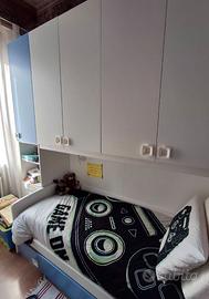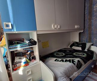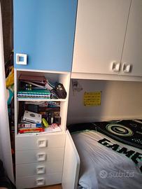 Vendo cameretta a ponte con due letti, 5 ante e 4 cassetti completa di due materassi. Colore bianco e avio. Misure 253x92x259 Disponibile dal 15 maggio Trasporto e Smontaggio a carico dell'acquirente.