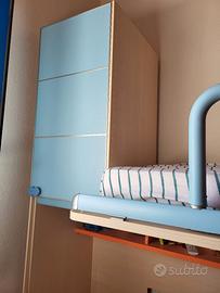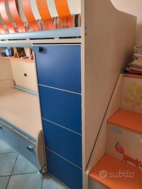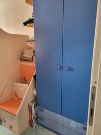 Cameretta moretti, con ampie armadiature e cassettoni comodi anche per la biancheria, comodino, scrivania con sedia, scaletta con contenitori per giochi, mensole per i libri e oggetti vari. Lo schienale non è perfetto perché tagliato per la presa della luce.