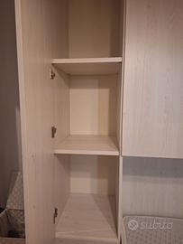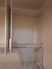 Cameretta a ponte come in foto. 4 ante e colonna armadio con 4 cassetti. 2 cassettoni nella parte sottostante il letto singolo completo di materasso nuovo a molle. misure 250x245x55 . Ingombro del letto 90cm