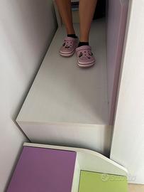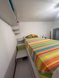 Vendo cameretta a ponte (marca Ferri Mobili) acquistata alcuni anni fa in ottime condizioni, costituita da: letto ad una piazza scorrevole accessibile mediante scaletta con gradini contenitore e rete metallica con doghe in legno, scrivania estraibile con ruote. Il letto è inoltre corredato di ringhiera di sicurezza rivestita con tessuto in tinta con i colori della struttura. La cameretta si sviluppa completamente su una parete. Essendo di recente produzione è possibile acquistare eventualmente accessori presso i rivenditori.