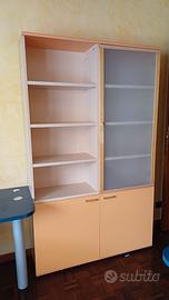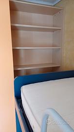 Cameretta a ponte arancione, blu, legno naturale con armadio 5 ante, scrivania, libreria.