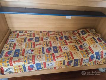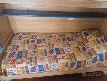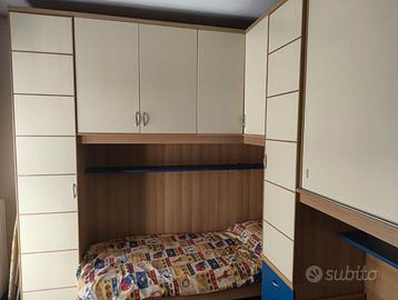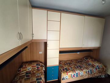 Vendo cameretta a ponte completa, composta da due letti singoli con struttura a ponte ad angolo, armadi pensili molto capienti, colonna con cassetti e cassettiera tutto incluso. MISURE: • Lato lungo: 345 cm • Lato corto: 245 cm • Profondità: 90 cm (compreso letto) • Altezza: 255 cm IL PREZZO INCLUDE: • 2 letti singoli (uno su ciascun lato) • Armadi a ponte con ante battenti • Colonna centrale con ante e cassetti • Cassettiera con cassetti blu • Mensole integrate Il trasporto è a carico dell'acquirente. Possibilità di visionare di persona, prezzo trattabile. Per altre info e/o foto scrivetemi pure in chat :)