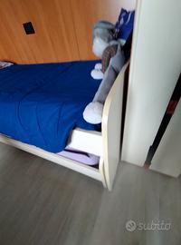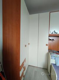 cameretta completa di due letti con ruote+ reti e materassi ,componibile con altezza 260cm lunghezza 405cm, profondità angolare 150 cm .ante di 45cm e ante scorrevoli sopra il letto di un totale di 210cm. BISOGNO DI TOGLIERLA FINE MARZO.