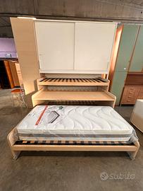 Cameretta a ponte frassino/beige completa di 2 letto scorrevoli e scrivania a scomparsa, ante superiori scorrevoli
