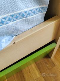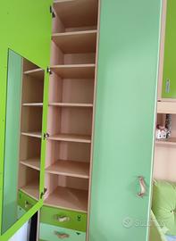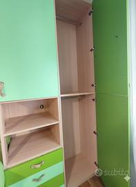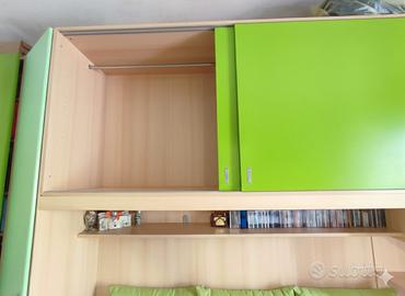 Vendo cameretta a ponte, inclusa di 1 materasso. MISURE armadio: H 260cm x L 420cm x P 60cm (parte sx che va a diminuire fino a 40cm di profondità) MISURE letto: P 90cm x L 210cm Condizioni ottime, pochi segni di usura come da foto. Da stringere e riallineare pannello secondo letto come da foto. Nella struttura attuale sono presenti maniglie in cuoio applicate in un secondo momento, ma consegno anche le maniglie originali verdi bicolore (vedi foto). Inclusi cuscini verdi corredati. La cameretta si trova ad un primo piano, smontaggio e trasporto a carico dell'acquirente. Possibilità di venirla a visionare e misurare
