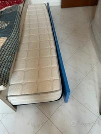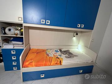 Cameretta a ponte 6 ante, colore bianco e blu, completa di due letti singoli (uno estraibile). Struttura funzionale con armadi superiori e laterali, libreria laterale a sinistra e 4 cassetti. In ottime condizioni. Si vende completa di materassi. Ideale per ottimizzare lo spazio in una stanza per bambini o ragazzi.