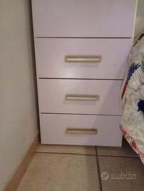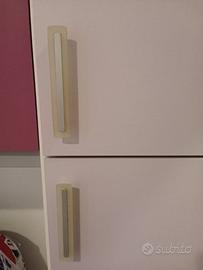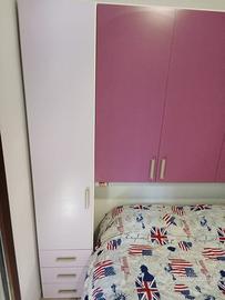 Vendo bellissima cameretta a ponte di colore lilla e fucsia, ideale per bambine e ragazze. La composizione prevede: - 1 ante laterale lilla, dimensioni anta sinistra (vista frontale) h. cm 185, largh. cm 44.5 + 3 cassetti h. cm 19, largh. cm 44.5 - 4 ante centrali fucsia, dimensioni h. cm 125, largh. cm 48.5 - 2 ante laterali a destra (vista frontale) dimensioni h. cm 121, largh. cm 44.5. Pratiche maniglie rivestite in gomma, completo di mensole e sbarre attaccapanni. Dimensioni totali: h. cm 242, larghezza cm 283. Doghe e materasso NON INCLUSI. Smontaggio e trasporto a carico dell' acquirente.