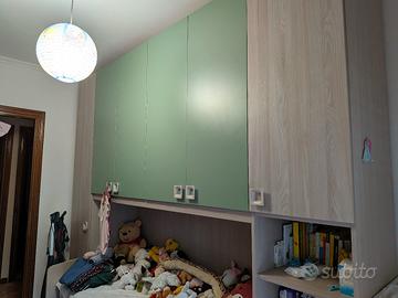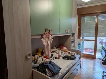 Composizione fissa, doppio letto a cassettone, un'anta lunga e 5 ante corte + 4 cassetti e due rientranze tra i 4 cassetti e l'anta corta di destra. Insieme alla struttura vendo anche i due materassi (usato il materasso del letto superiore una sola volta, quello inferiore mai usato).