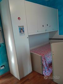 cameretta a ponte con due letti scorrevoli ed armadio a colonna, scrivania con armadio a colonna e sedia, due panche capienti porta oggetti e due mensole, la cameretta si presenta in buono stato e puo essere una buona soluzione per risparmiare avendo due bambini nella stessa stanza