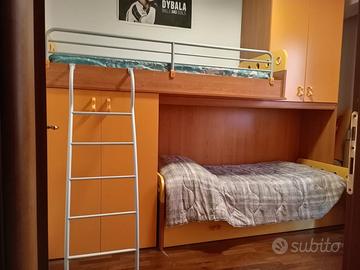 cameretta a ponte con armadio e angolo libreria più scrivania.
