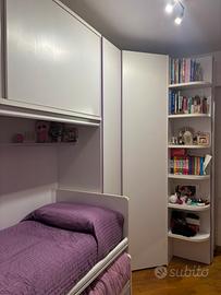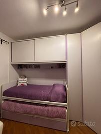 Cameretta a ponte bianca con rifiniture lilla con due letti estraibili, cabina armadio angolare ampia, libreria, ante scorrevoli superiori, cassetti estraibili in basso (da sistemare) Smontaggio e trasporto a carico dell’acquirente
