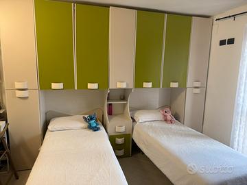 Vendo cameretta a ponte moderna e funzionale, ideale per ottimizzare lo spazio. ✔️ 2 letti singoli ✔️ Struttura a ponte con armadi capienti ✔️ Comodini e cassetti integrati ✔️ Colore bianco e verde, adatta sia per maschio che femmina la cameretta è in buone condizioni