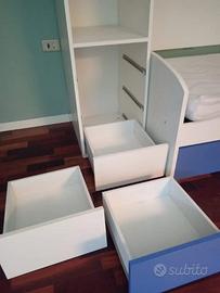 Cassetti e Contenimento: Presenti tre ampi cassetti inferiori estraibili per contenere biancheria o vestiti (due blu e uno bianco), per un grande spazio salvaspazio