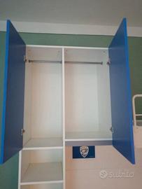 Armadiatura Integrata: Struttura che include un capiente armadio a due ante superiori (ante blu) con doppi bastoni appendiabiti, e un vano a giorno laterale con mensole