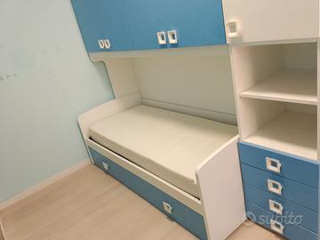 Vendo cameretta a ponte bianco/azzurra 5 ante, due ripiani e 4 cassetti con letto singolo più rete secondo letto estraibile (materasso con fodera in cachemire lavabile se richiesta) + scrivania colori abbinati + sedia ergonomica
